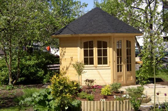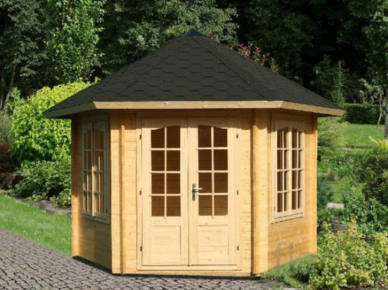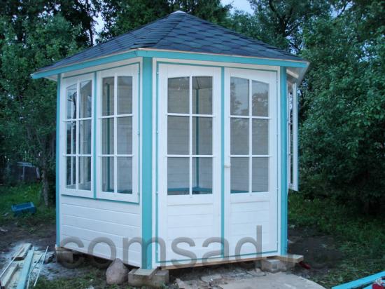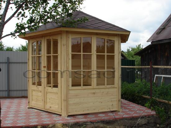 Беседка-павильон «Рената» состоит из шести модулей (2 стены с окнами + 1 стена с дверью + 3 глухих стены), изготовленных из профилированной доски толщиной 21 мм.