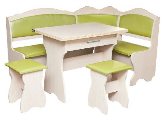 Описание : Вам нужен уголок для кухни? — стол? — табуретки? Вам необходимо приобрести кухонный комплект Елена. В этом комплекте есть все. Удобный раскладной стол — книжка, большой уголок и две маленькие табуретки. В уголке предусмотрено место хранения, ящики под каждым сиденьем. Ящик в столе, для хранения столовых приборов. Спинка уголка, декорирована незамысловатыми уголками, которые придают уголку изящность. Столешница — ДСП.